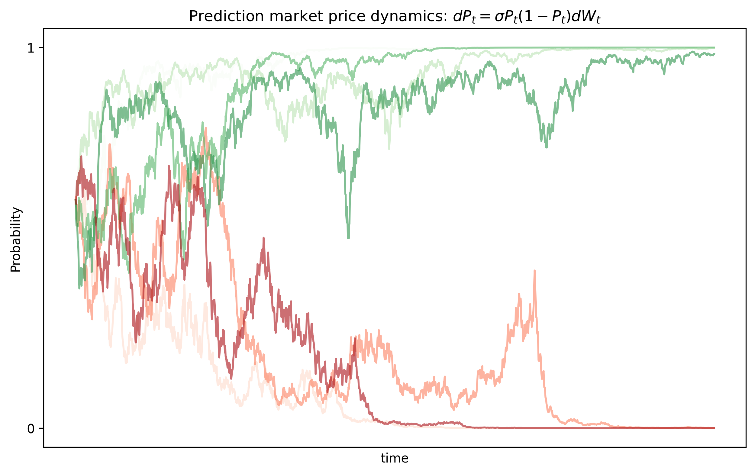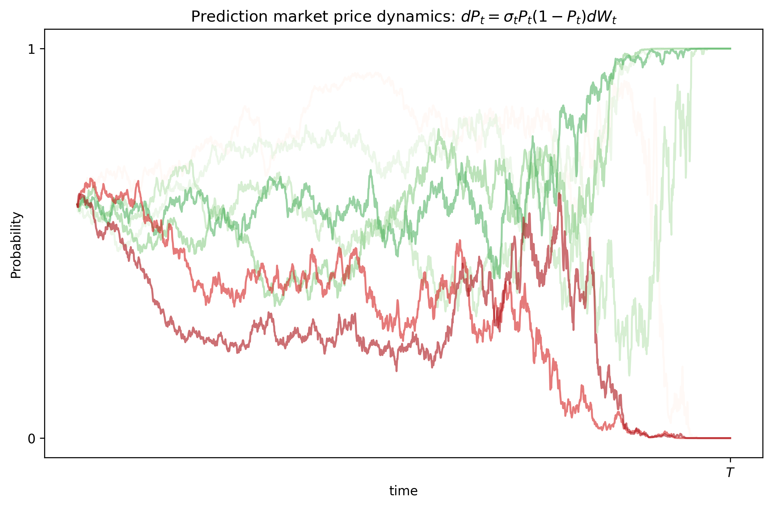 $$ \boxed{\,dP_t=\sigma P_t(1-P_t)\,dW_t\,.} $$Notice that the model satisfies $P_t \in [0,1] $ and becomes constant when $P_t$ is 0 or 1. However, this model might not be able to arrive at a conclusion when the event is supposed to end, i.e., $P_T = 0 \text{ or }1$ (see the Experiments). See Appendix B for a follow up on this issue.